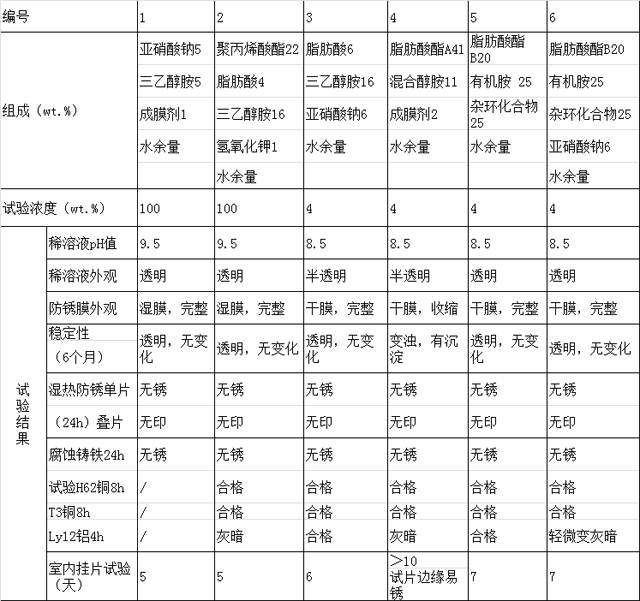 配方篩選:基于水基金屬防銹劑的特點(diǎn),我們采用添加劑協(xié)同作用原理,配制一系列樣品,進(jìn)行評(píng)價(jià)和篩選,尋找各種添加劑的有機(jī)組合,部分配方和試驗(yàn)結(jié)果如表1所示。